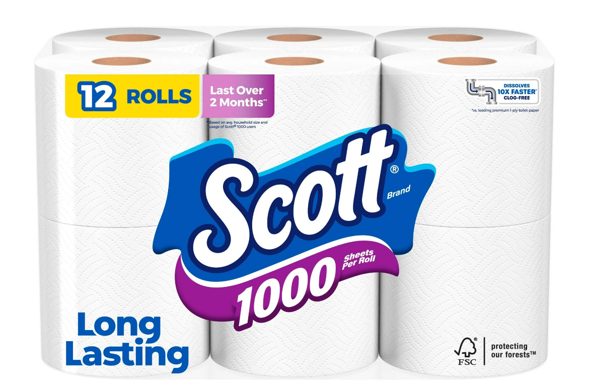 Scott 1000 Toilet Paper, 12 Rolls, 1,000 Sheets per Roll
